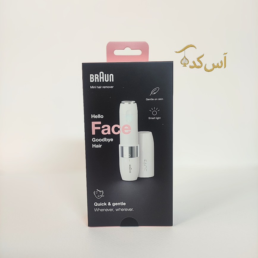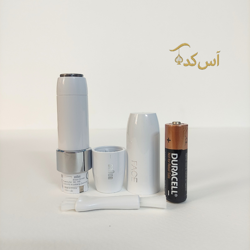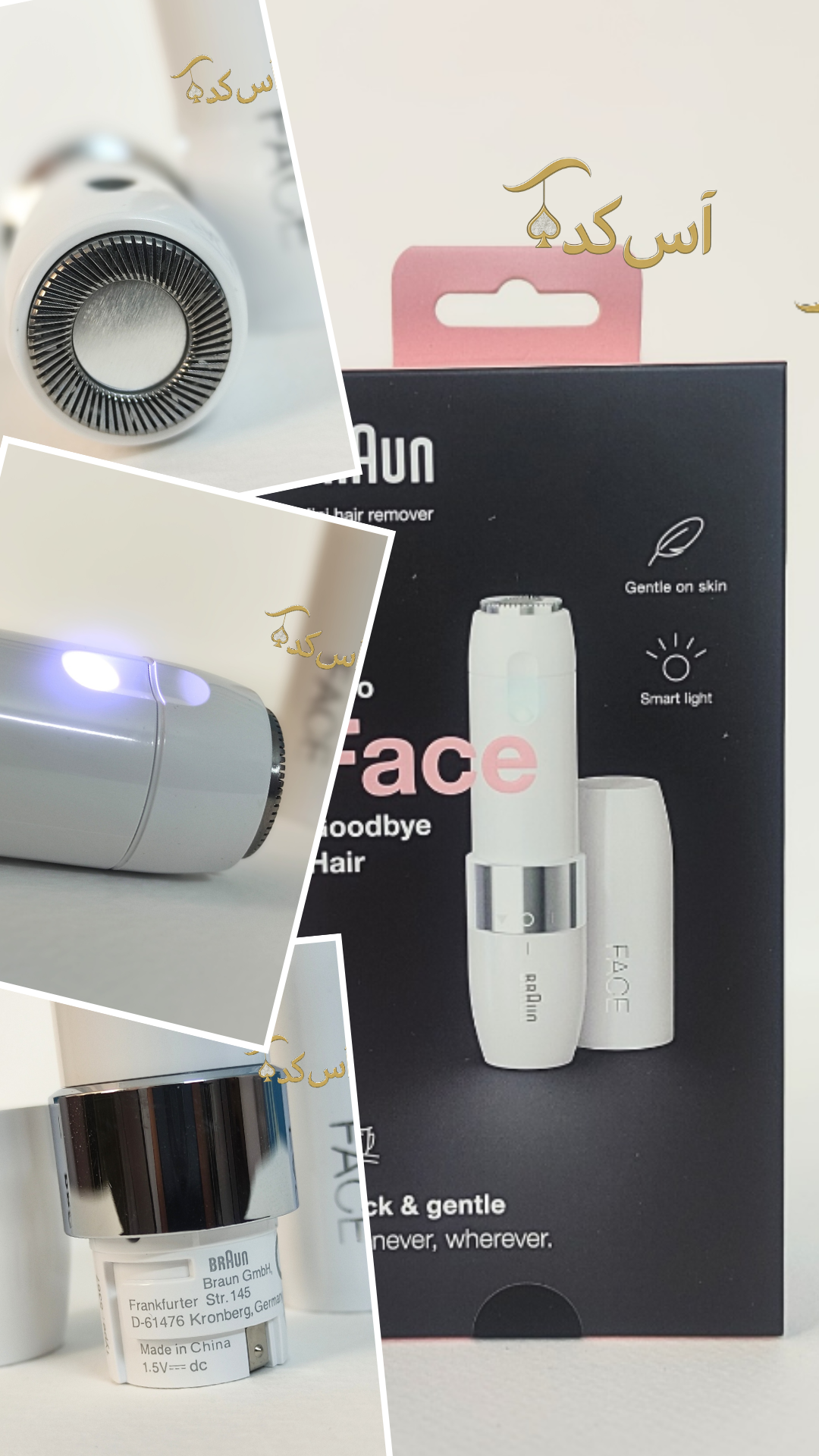دستگاه شیور صورت براون مدل FS1000 با تیغه فولادی ماندگار و نور LED، مناسب برای از بین بردن موهای ریز صورت بدون تحریک پوست. طراحی سبک و قابل حمل با باتری قلمی AA.